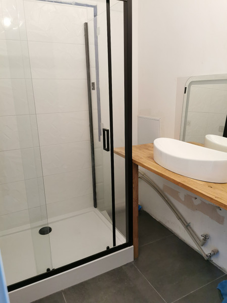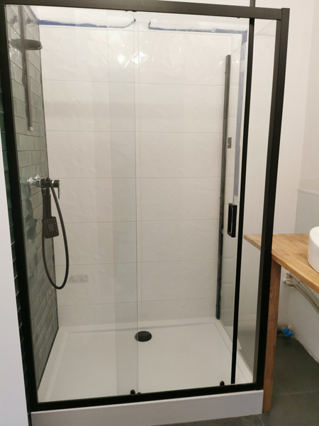 • Nowoczesna łazienka z dużą kabiną prysznicową .