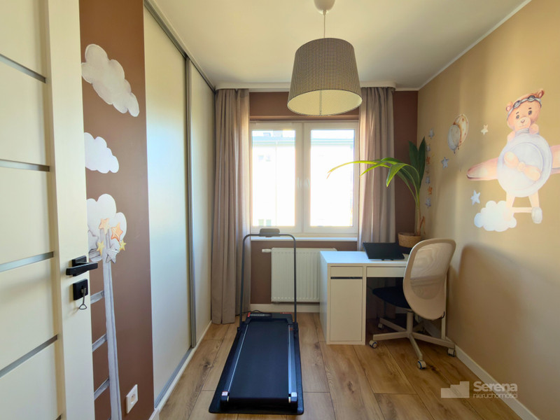 - pokój (7,7 m²): obecnie pokój dziecięcy, ale idealny również na biuro do pracy zdalnej