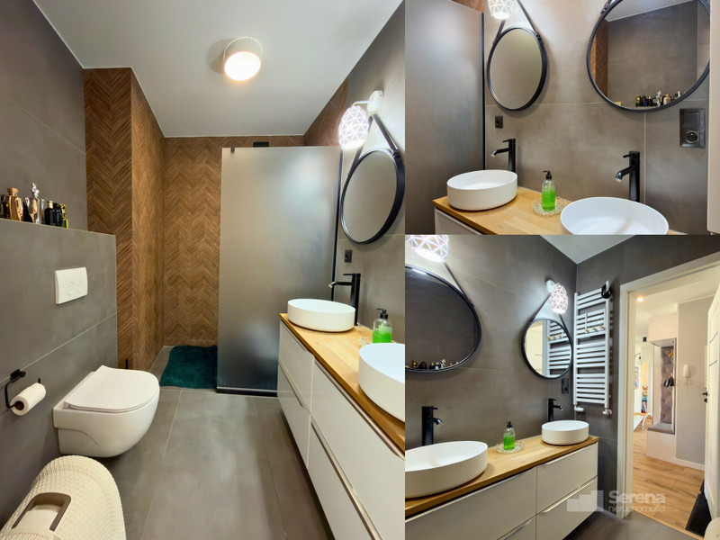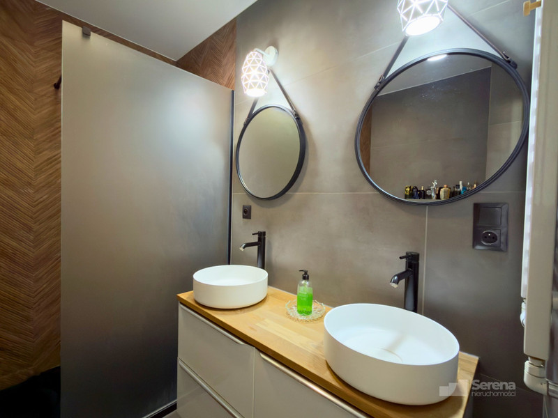 - stylowa łazienka (4,4 m²): wyposażona w dwie umywalki, co znacząco ułatwia poranną logistykę oraz prysznic - jeśli jednak zamarzysz o wannie, to spokojnie taka się zmieści