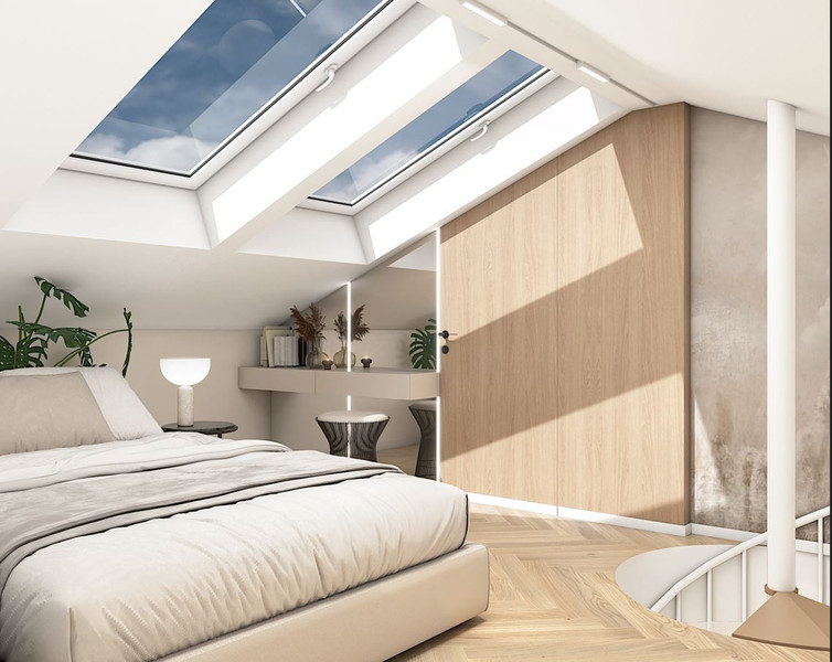 schody kręcone prowadzą do dużej sypialni na poddaszu- 9,7m2 (po obrysie 17m2)