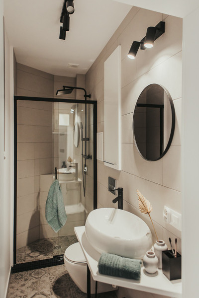 • nowoczesna łazienka z prysznicem typu walk‑in, umywalką nablatową i WC, wykończona w jasnych, ponadczasowych materiałach,