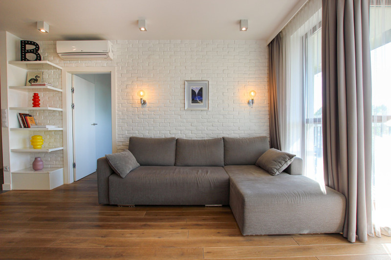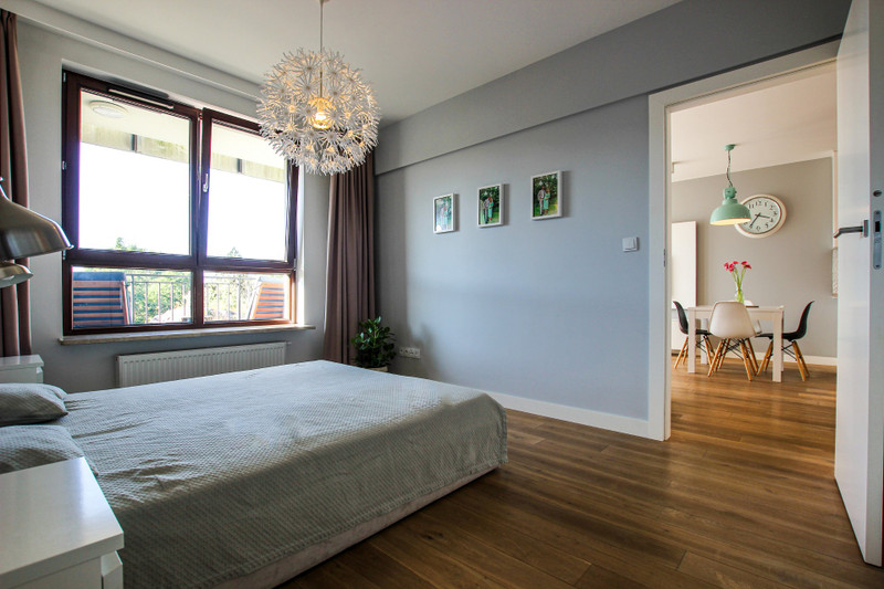 Mieszkanie ma ekspozycję południowo-zachodnią, co w połączeniu z panoramicznymi drewnianymi oknami gwarantuje odpowiednie doświetlenie o każdej porze dnia. Ilość wpadających promieni słonecznych można regulować firankami bądź zasłonami przygotowanymi na wymiar. O temperaturę w mieszkaniu dba klimatyzacja.