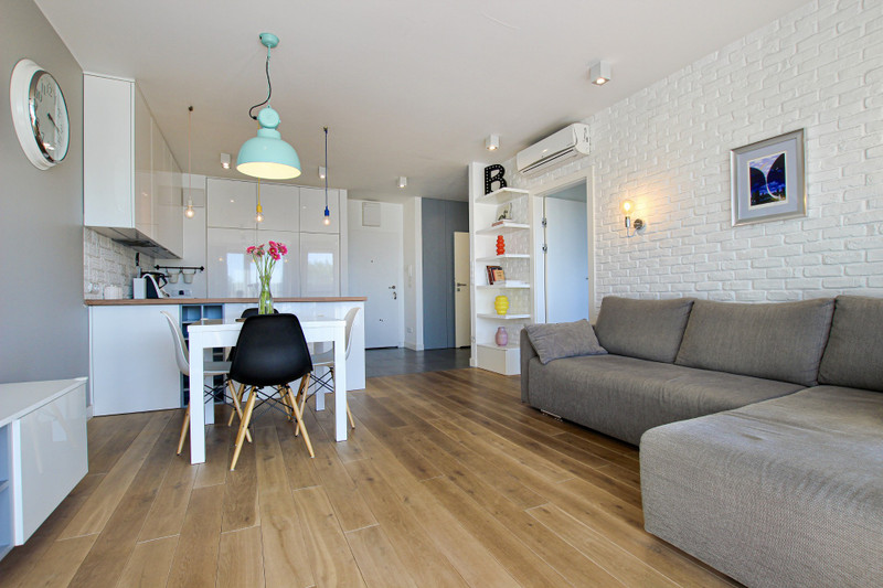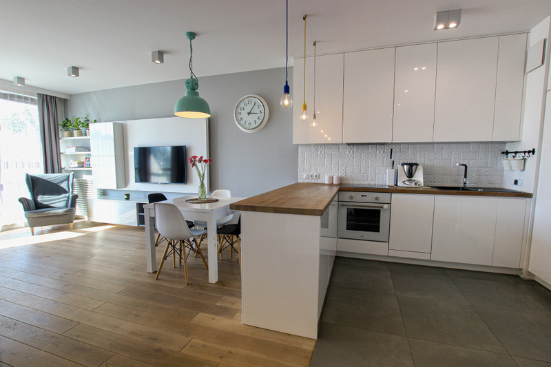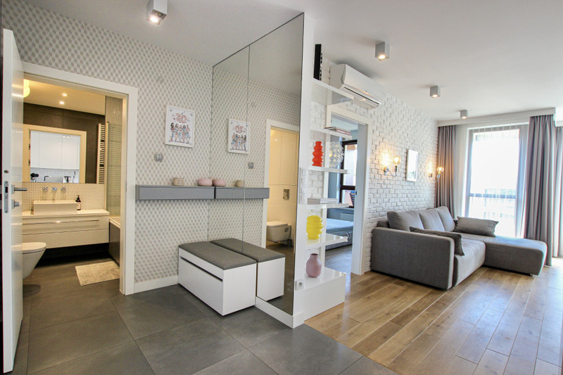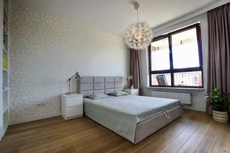 Jasne, nowoczesne wnętrze mieszkania zostało zaprojektowane przez renomowane warszawskie studio architektoniczne FUGA, które zadbało o funkcjonalny układ pomieszczeń, wysokiej jakości materiały i spójny design zapewniający komfort oraz estetykę przestrzeni. Zabudowa kuchenna, łazienkowa, szafy w przedpokoju i sypialni zostały przygotowane na wymiar przez stolarza. W całym mieszkaniu położona jest piękna drewniana podłoga (bielona deska dębowa).