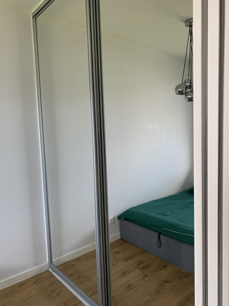 • Cozy bedroom with a bed and a large mirrored wardrobe