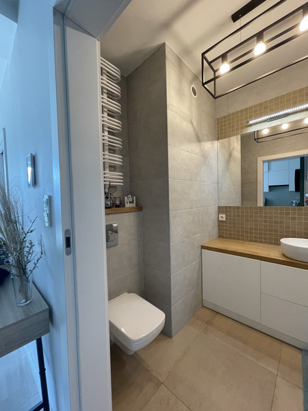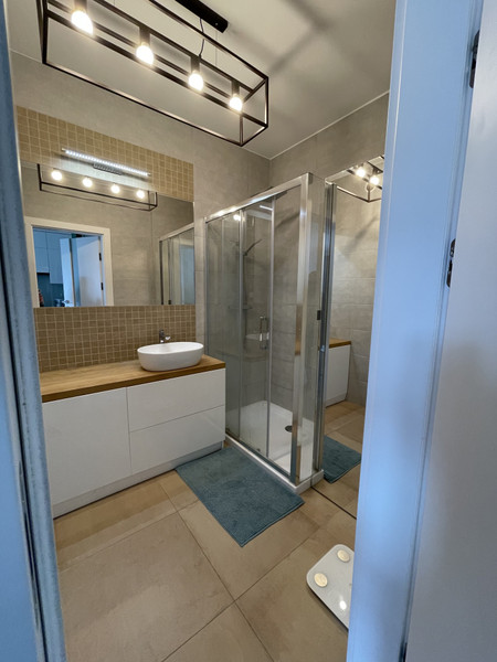 • łazienka z prysznicem, umywalką, pralką, WC, szafą z lustrem