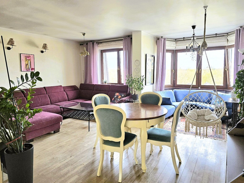 W salonie, zamiast balkonu, znajduje się wykusz z dużymi oknami, zapewniającymi piękny widok i dużo naturalnego światła, dlatego wstawiliśmy tutaj 4-osobową sofę, ale kiedyś stał w tym miejscu duży stół i była to przestrzeń do rodzinnych spotkań przy posiłku.