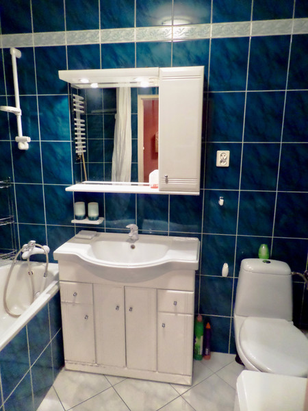 c) łazienka z kompletem mebli, wanną, pralką