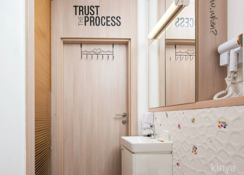 Nowoczesna łazienka z prysznicem, umywalką oraz wc, suszarką do włosów, żelazkiem,odkurzaczem.