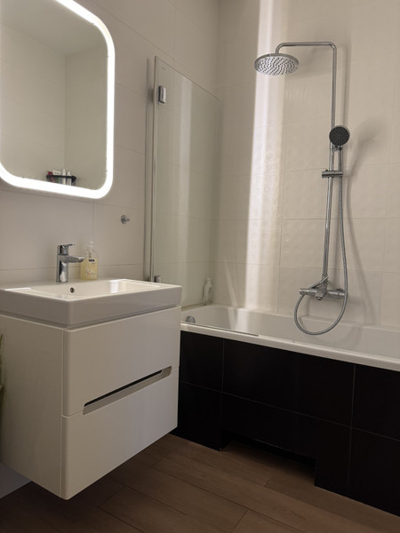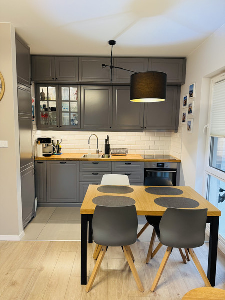 Mieszkanie znajduje się w nowoczesnym budynku z 2018 roku. Jest rozkładowe i niezwykle jasne dzięki wysokim oknom sięgającym od podłogi.