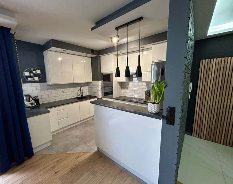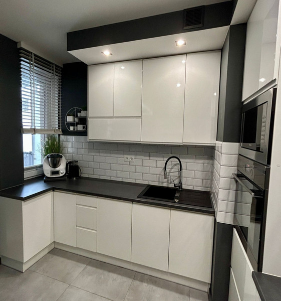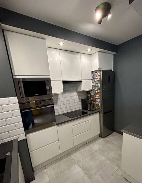 Kuchnia wykonana na wymiar w białym połysku. W roku 2024 wymiana zmywarki.