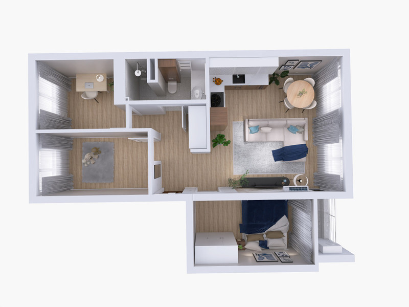 Zdjęcia przedstawiają aktualny stan nieruchomości wyposażony w aranżację wnętrza, która nie jest przedmiotem sprzedaży. W cenę wchodzą meble związane z nieruchomością: kuchnia, AGD i zabudowa w łazience. Pozostałe elementy stanowią jedynie dekorację.