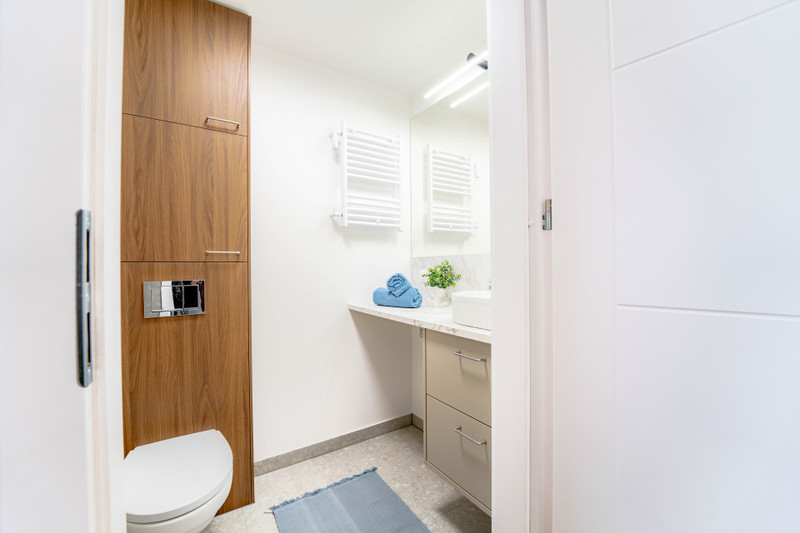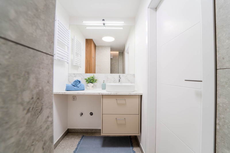 • Łazienki z WC wyposażonej w nowoczesną armaturę, w tym umywalkę, prysznic typu walk-in z zabudową podtynkową i miejscem na pralkę.