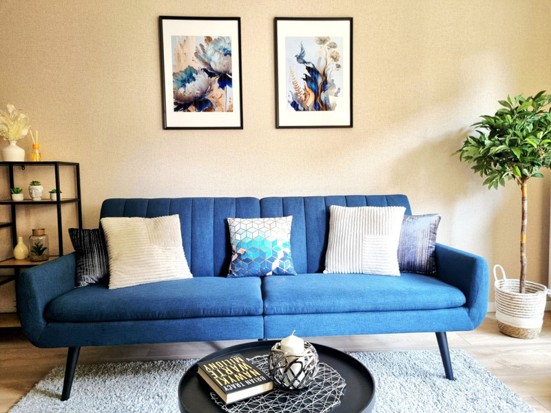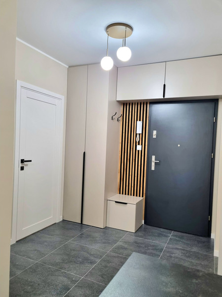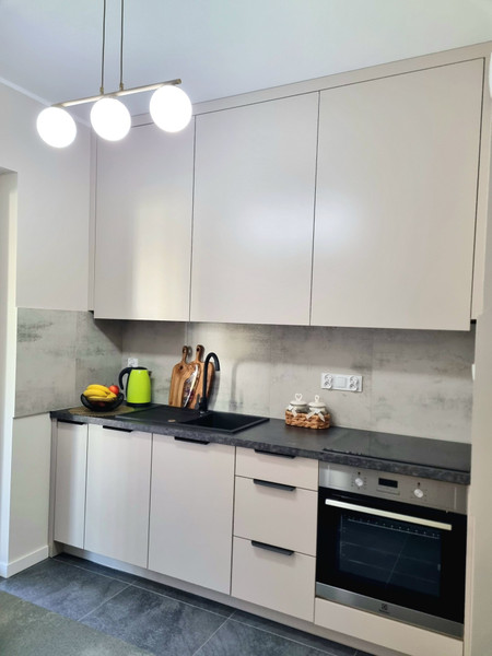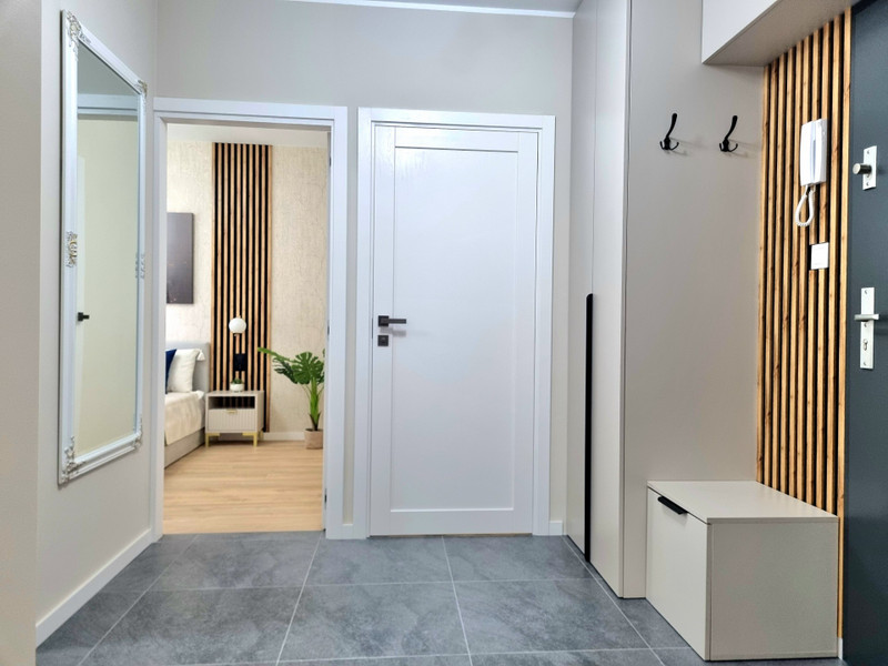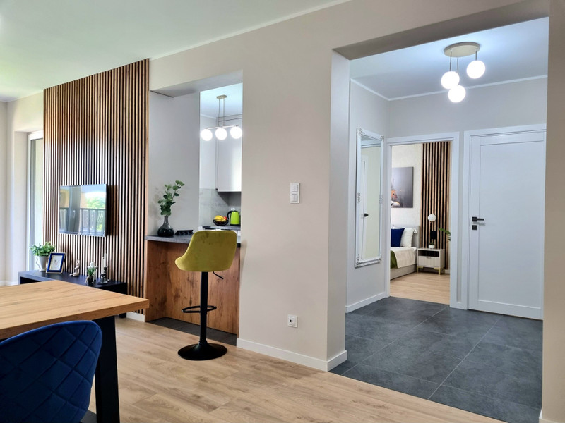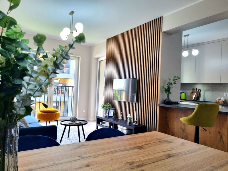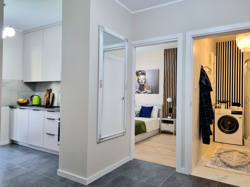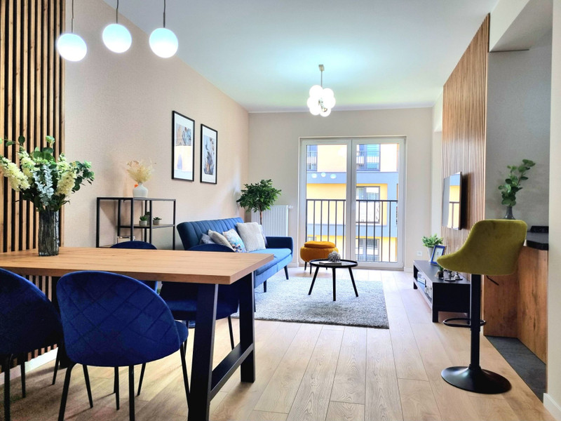 Mieszkanie jest jasne, urządzone w wysokim standardzie, częściowo umeblowane i wyposażone w sprzęt AGD. Salon z aneksem kuchennym i wyjściem na balkon tworzy przytulną przestrzeń do codziennego życia, a sypialnia zapewnia prywatność i spokój.