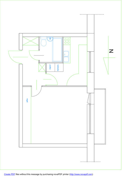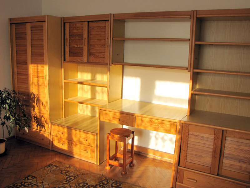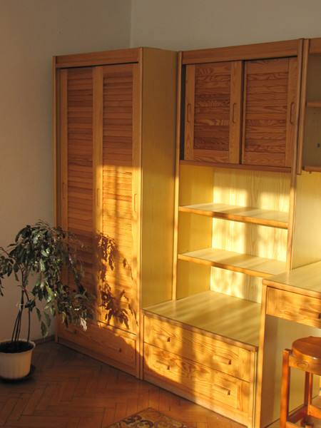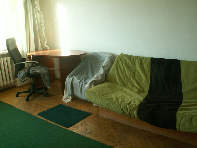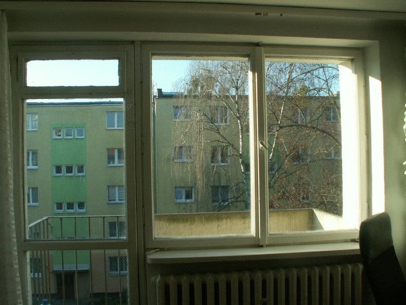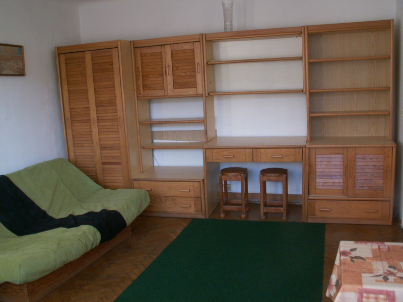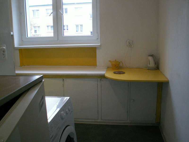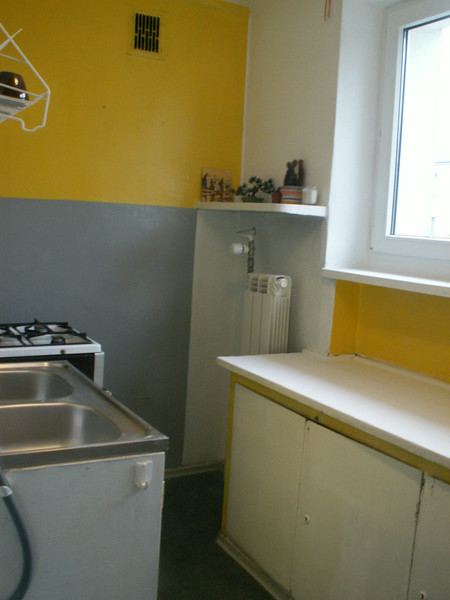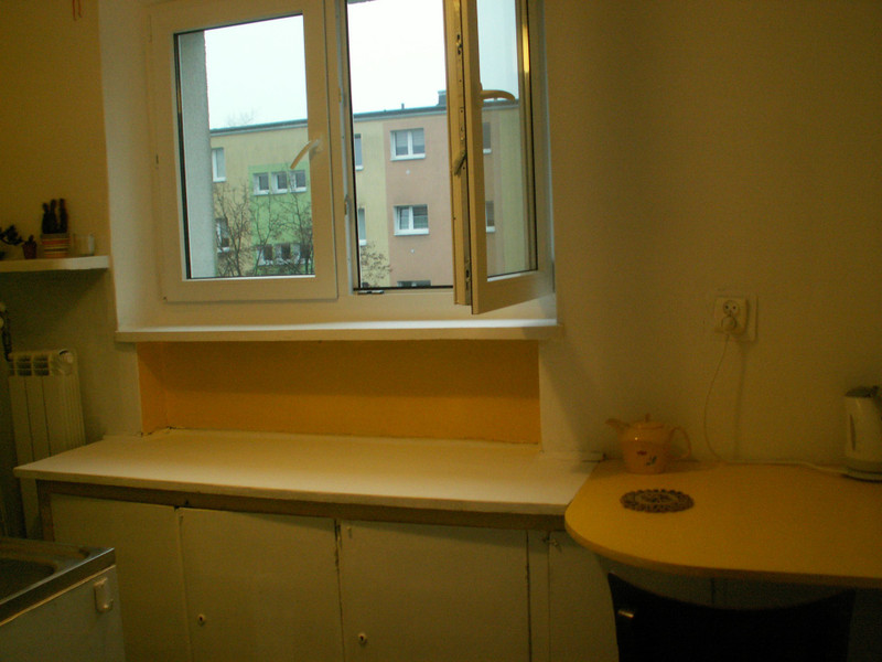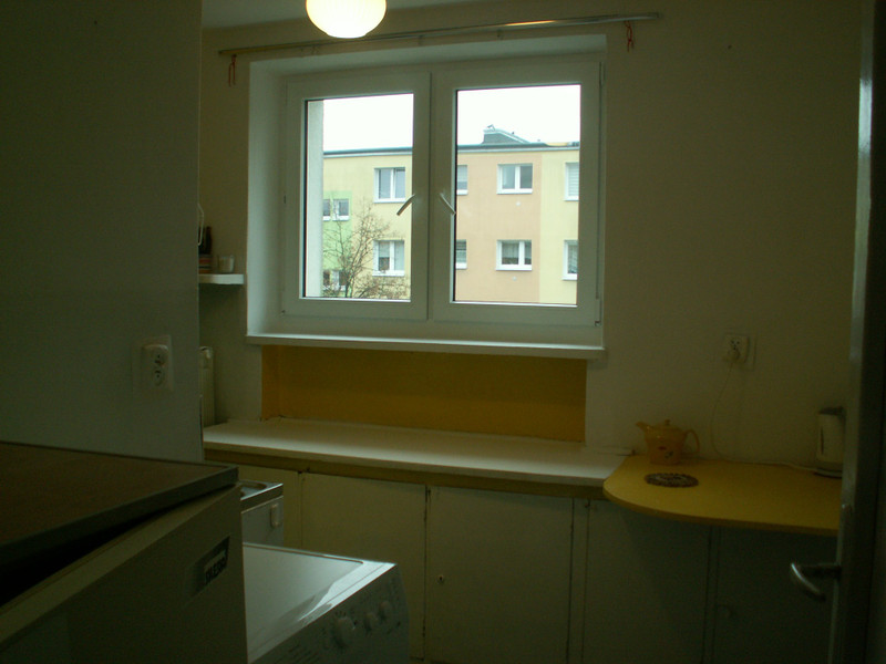 Wykończenie. Podłoga w pokoju - parkiet, w przedpokoju parkiet i pvc, w kuchni wykładzina pvc, w łazience terakota. Na ścianach w łazience glazura. Wyposażenie. W pokoju : regał, kanapa rozkładana, fotel, stół, stolik, krzeslo biurowe, taborety. Dodatkowy materac do spania (w razie potrzeby). W przedpokoju są 2 szafy wbudowane. W łazience wanna, umywalka, sedes, szafka z lustrem. W kuchni ciąg szafek z blatem, miejscem do jedzenia z krzesłem oraz kuchenka gazowa z piekarnikiem, zlewozmywak, lodówka i nowa pralka. Nowe okno pvc (wymiana w grudniu 2025).