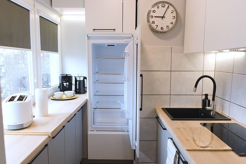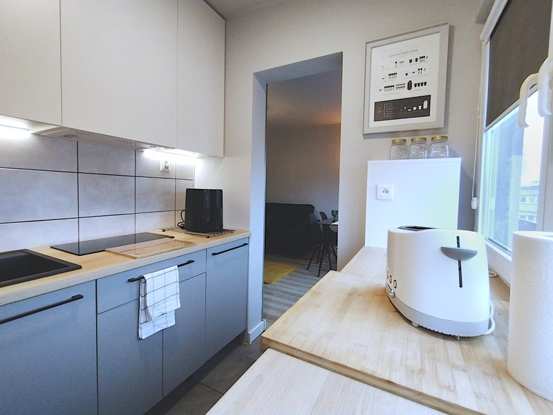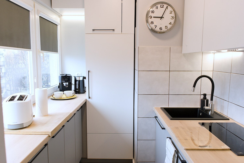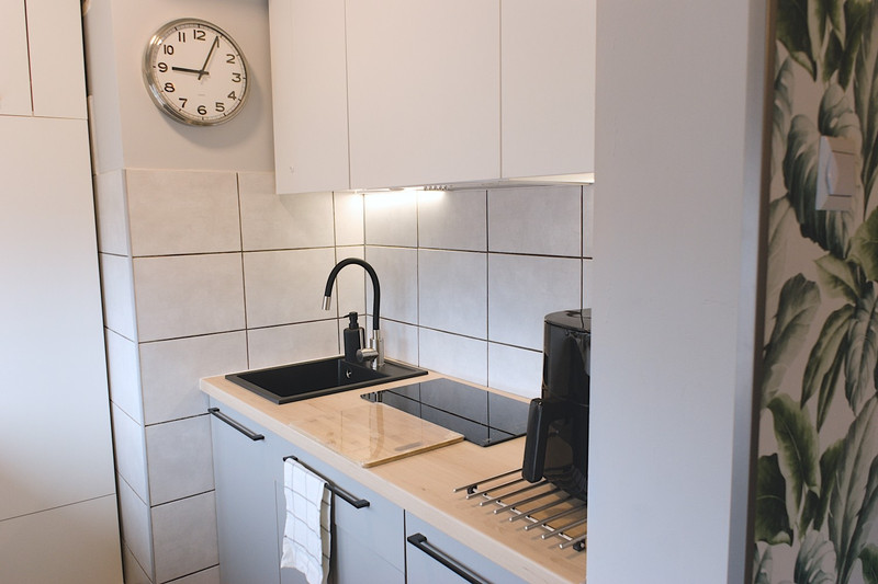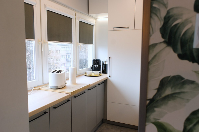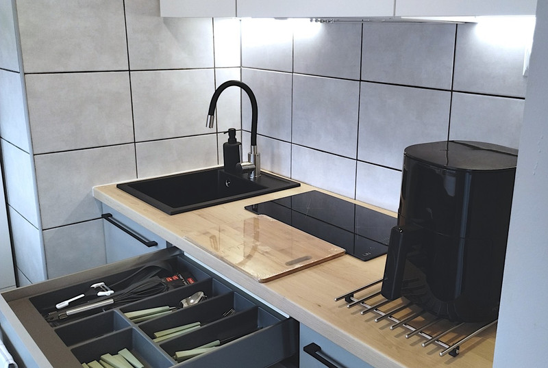 * kuchnia (nowa zabudowa i sprzęty! ) - lodówka, zmywarka, kuchenka-płyta indukcyjna, air fryer, mikrofalówka, toster, ekspres do kawy, czajnik. Blat roboczy liczący 2,5 metra + drugi z wydzieloną strefą gotowania - wszystkie meble w zabudowie, kompletne wyposażenie: talerze, sztućce, garnki.