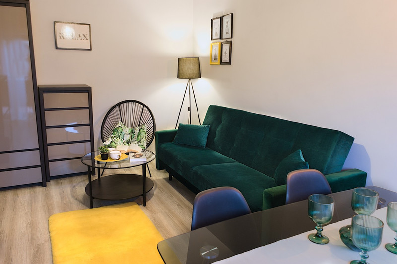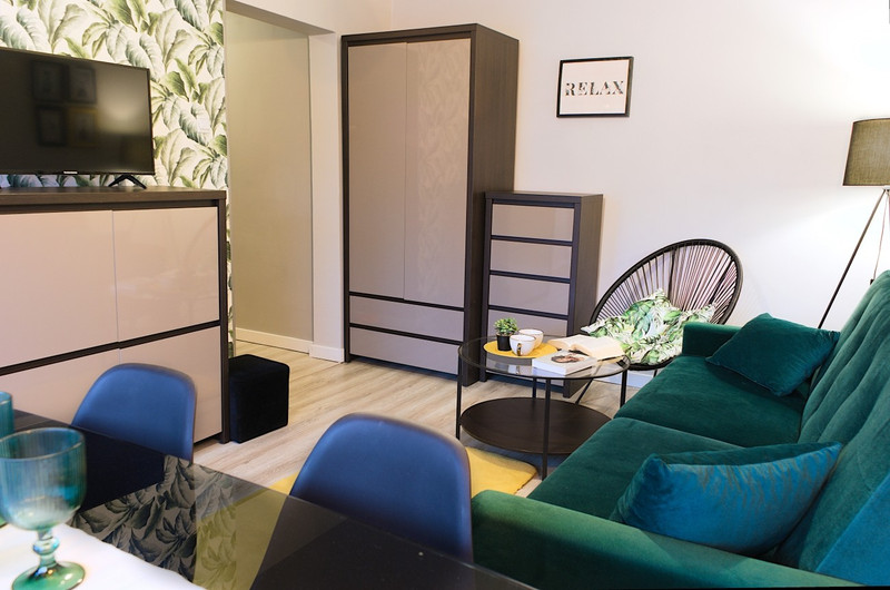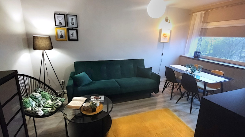 * pokój/salon - sofa z funkcją spania + fotel + stolik kawowy; TV z opcją smartTV, szafa, komoda i szafka pod TV, stół i 4 krzesła;