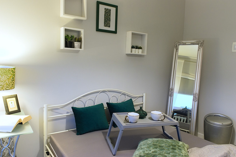 * sypialnia - łóżko 140x200cm, lustro, komoda, stolik.