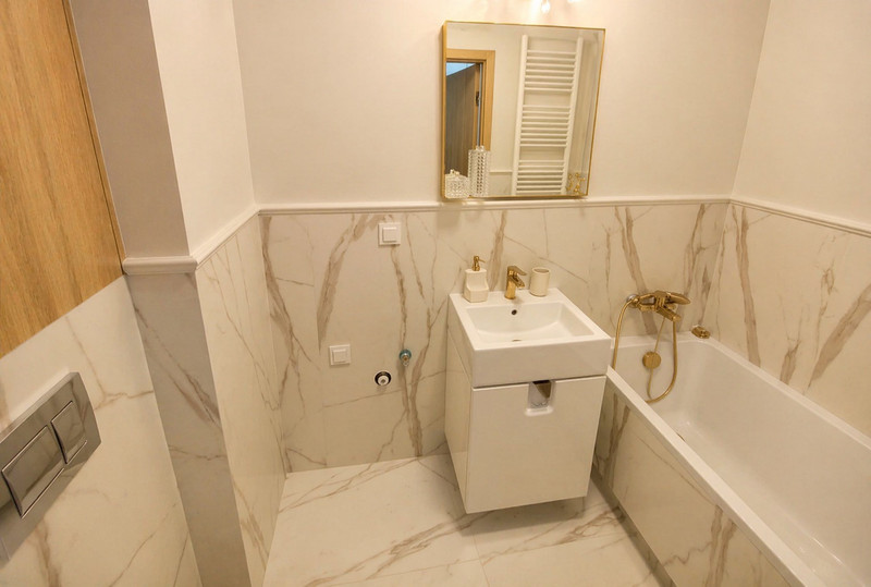 Mieszkanie ma ekspozycję południowo - zachodnią a okna są zorientowane na patio budynku, co zapewnia ciszę i spokój. W pełni wyposażone, z praktycznymi udogodnieniami, takimi jak zmywarka i pralko-suszarka