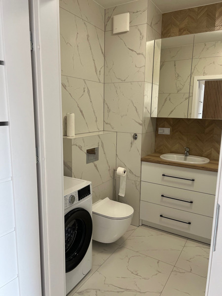 - Łazienka z prysznicem, wyposażona w pralkę