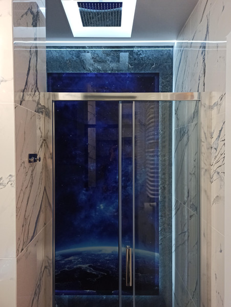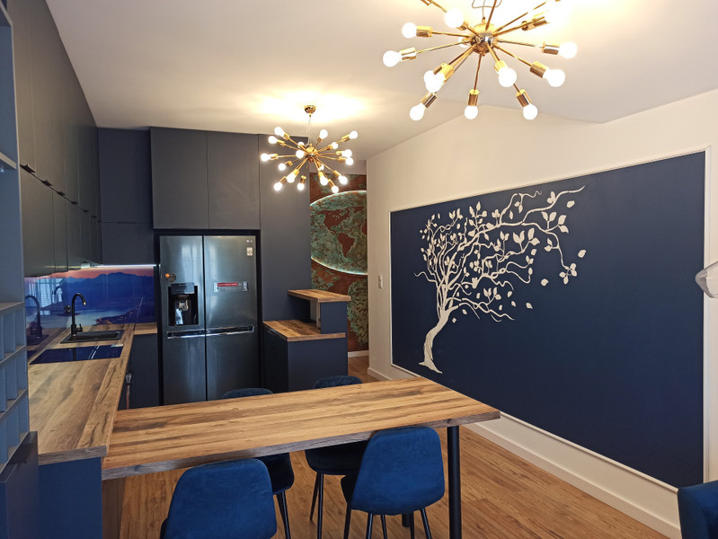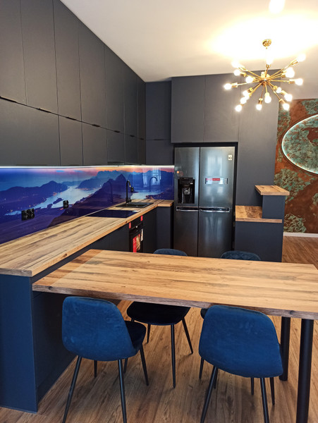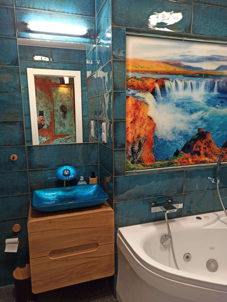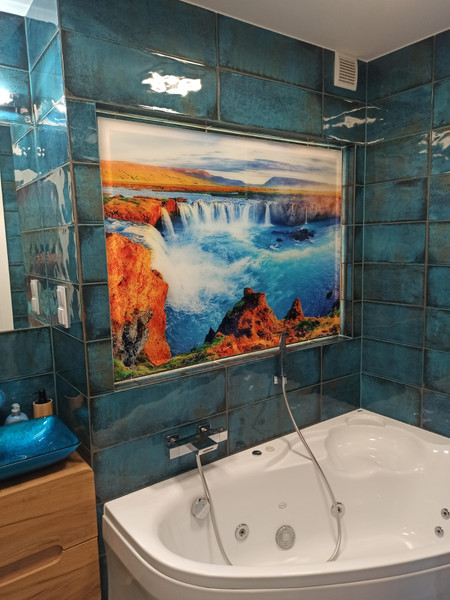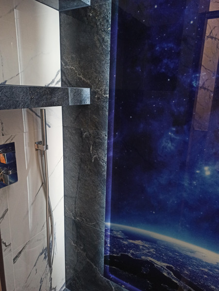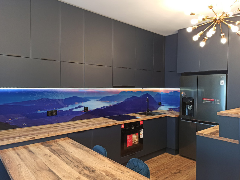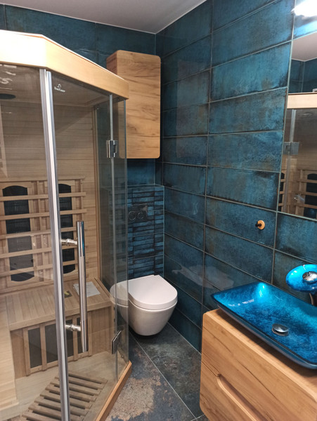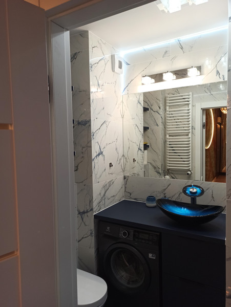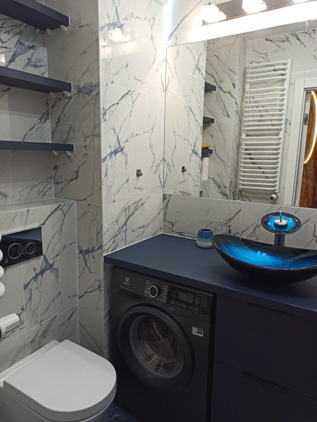 Kuchnia wykonana na zamówienie z wykończenie między szafkami ze szkła hartowanego z indywidualną grafiką, podświetlone ledami. Mieszkanie ma dwie łazienki. Pierwsza łazienka z bardzo dużym prysznicem, utrzymana w klimacie granatu z grafiką pod prysznicem oraz podświetloną instalacją led - daje to uczucie intymności. Piękny blat robiony na zamówienie z najwyższej jakości materiału. Druga łazienka jest natomiast domowym SPA, łazienka utrzymana w tonacji ciepła, koloru turkusowym, na podłogach hiszpański gres z manufaktury, w łazience bardzo duża wanna z hydromasażem pozwalająca na unikalny relaks, w łazience zamontowano piękną grafikę z indywidualną aranżacją całość odpowiednio podświetlona pozwalająca na całkowite wyciszenie się po ciężkim dniu. Całości dopełnia dwuosobowa sauna na podczerwień, więc można poczuć się jak w SPA, ale we własnym domu. Dodatkowym pięknym szczegółem jest umywalka i bateria w kolorze turkusu. Jedyna i niepowtarzalna łazienka - warto zobaczyć.
