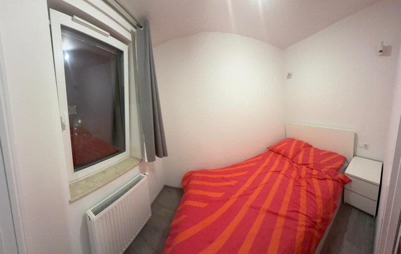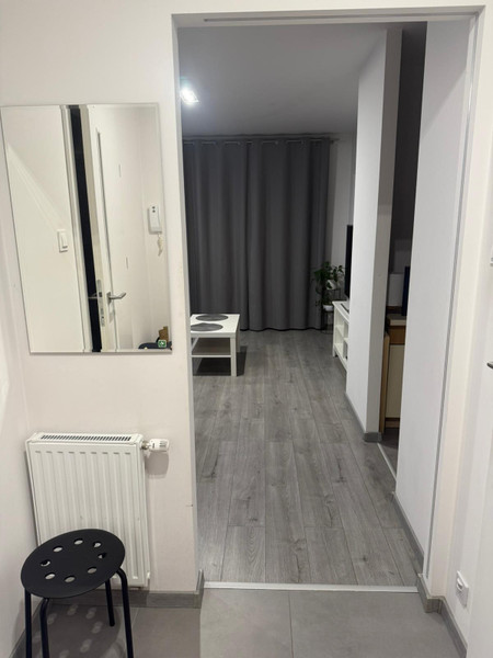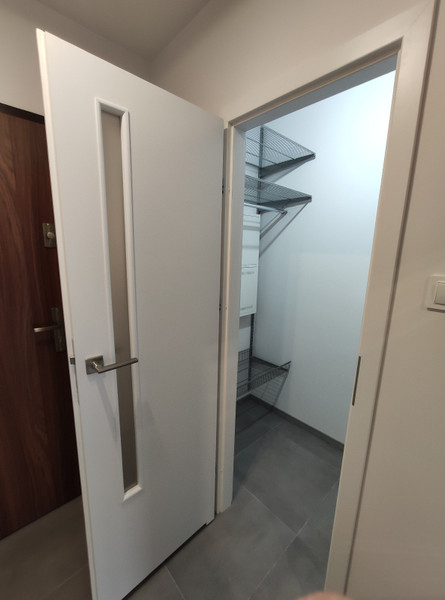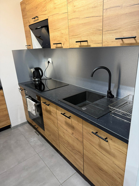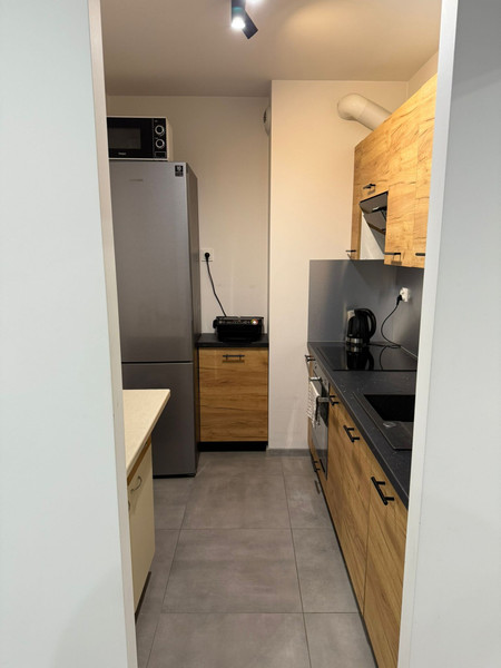 Sypialnia posiada okno, z salonu możliwość wyjścia na balkon. Między pokojami zastosowano drzwi chowane w ścianie co dodatkowo pozwoliło zaoszczędzić miejsce. Mieszkanie znajduje się na 2 piętrze w bloku z windą. Jest w pełni umeblowane. Na wyposażeniu zmywarka, mikrofala, piekarnik, płyta indukcyjna, okap, lodówka, pralka, klimatyzacja.