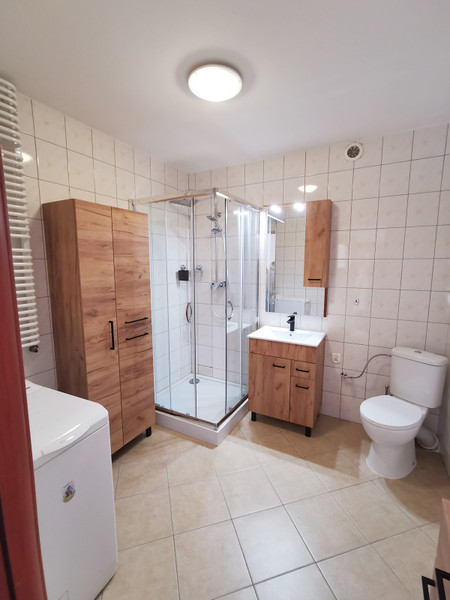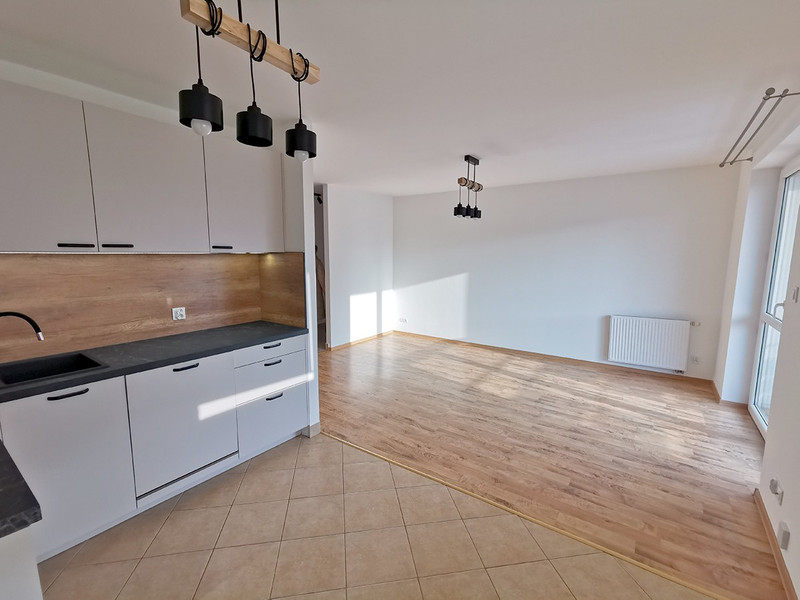 Mieszkanie umiejscowione jest na 1 piętrze, 2 piętrowego apartamentowca, składa się z pokoju dziennego połączonego z kuchnią, drugiego pokoju, łazienki, garderoby oraz przedpokoju, a także miejsca w garażu podziemnym. Zostało odnowione, a kuchnia jest zupełnie nowa, zaprojektowana pod wymiar, na zamówienie. W tym momencie oprócz łazienki i kuchni w mieszkaniu nie ma mebli. Zostaną dokupione wg preferencji wynajmującego.
