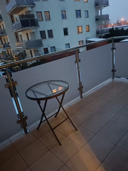 Duży balkon z dodatkowym stolikiem.