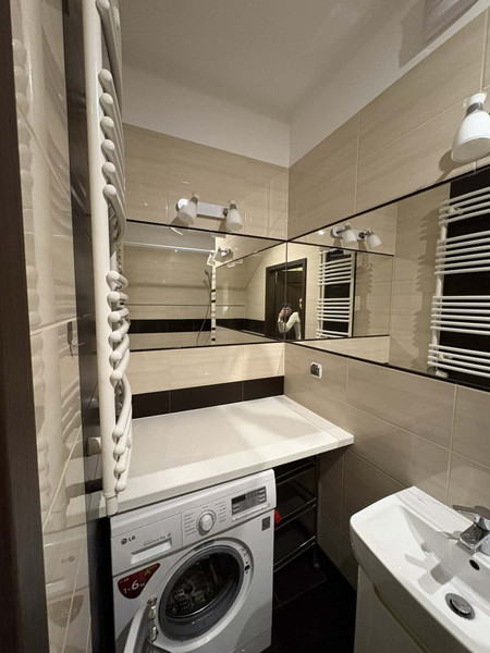 Łazienka z wanną, pralka.