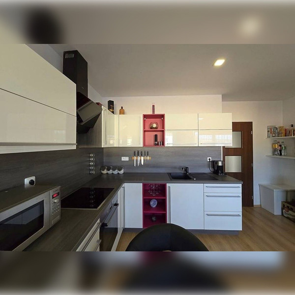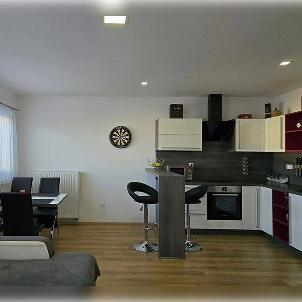 Wewnątrz znajdziesz jasny pokój z dużymi oknami i wysoką jakością wykończenia. Kuchnia posiada nowoczesne sprzęty: lodówkę, płytę, zmywarkę i piekarnik.