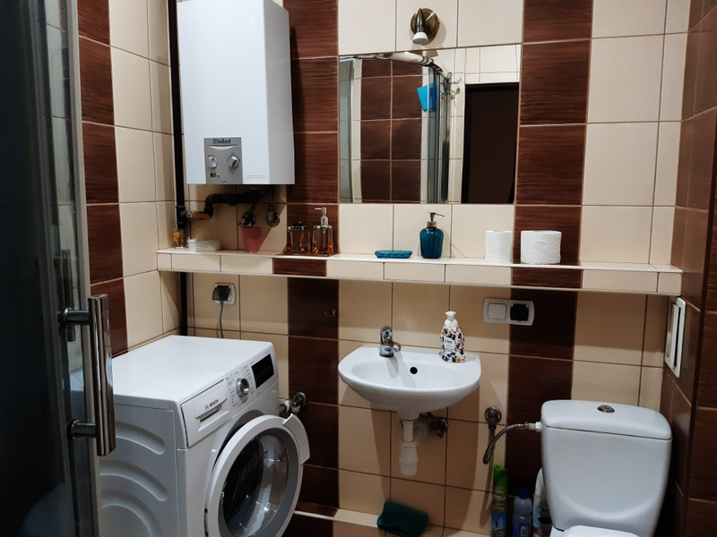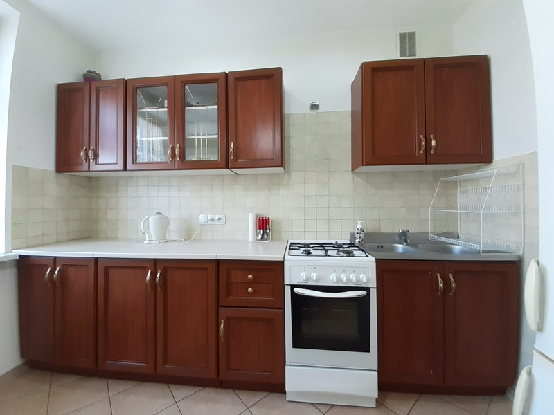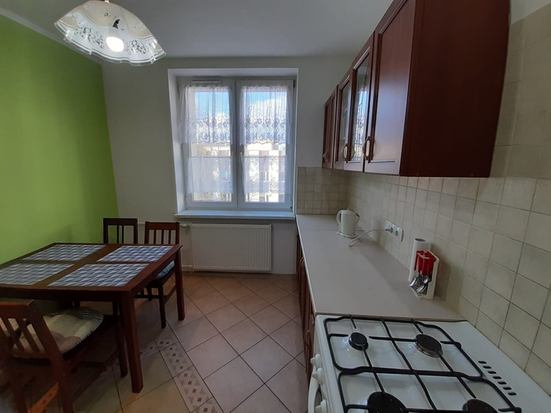 W kuchni znajdują się meble, lodówka i kuchenka gazowa. Pokoje umeblowane. Łazienka z kabiną prysznicową i pralką. Mieszkanie jest przestronne, pokoje ustawne. Balkon francuski.