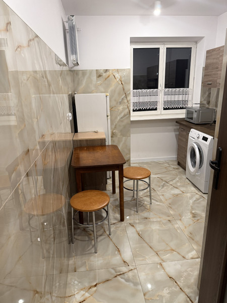 Mieszkanie umeblowane. Na wyposażeniu lodówka, pralka, kuchenka mikrofalowa, stół krzesła, meblościanka, łóżko i szafa w sypialni.