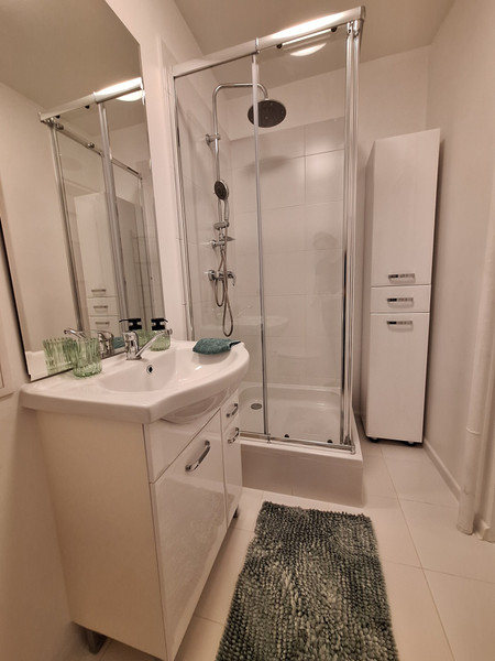 Łazienka jak w spa: Czysta, biała, z przestronną kabiną prysznicową i deszczownicą.