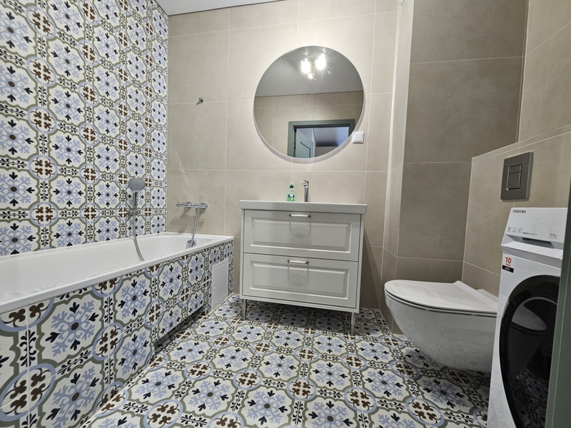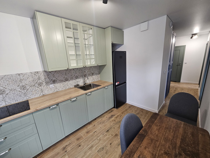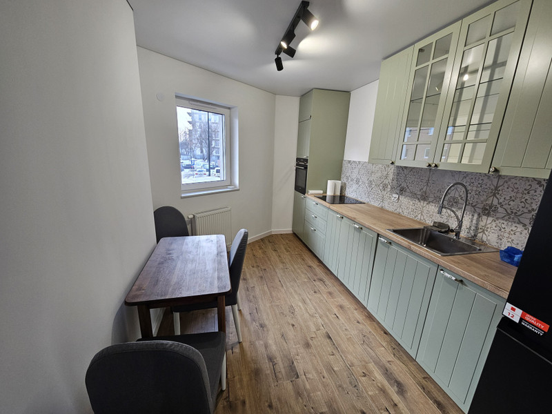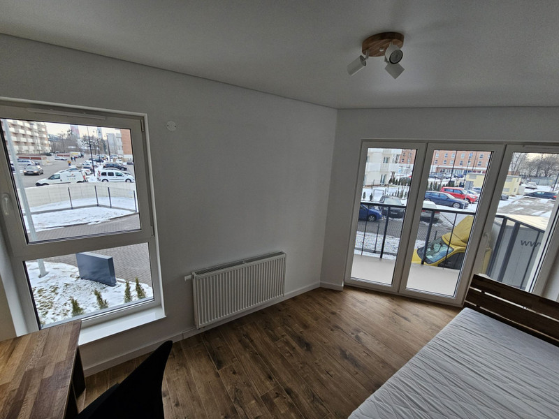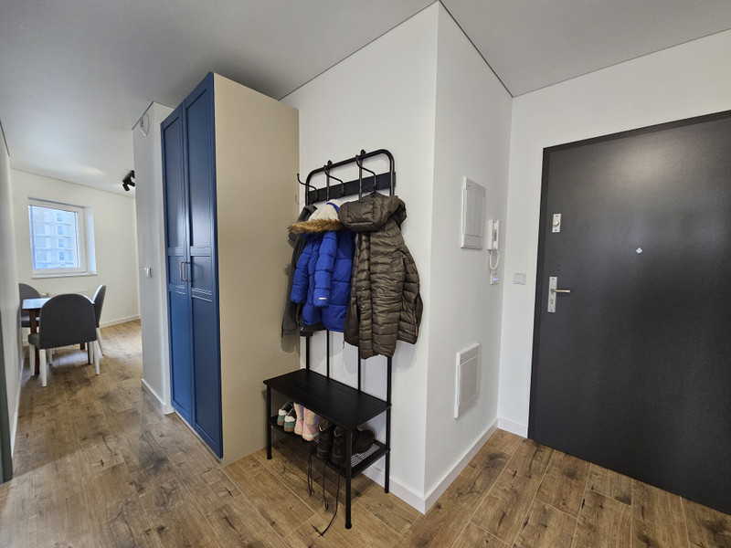 Mieszkanie usytuowane na pierwszym piętrze, z windą, w pełni wyposażone i umeblowane. Oba pokoje zamykane i wyposażone w podstawowe meble, wygodne dębowe łóżko z materacem, dębowe biurko i przestronna szafa. Obie sypianie mają wyjście na osobne, przestronne balkony. W kuchni nowoczesne meble z lodówką Toshiba, piekarnikiem Siemens, zmywarką i płytą indukcyjną Bosch oraz stolikiem z krzesłami. W łazience nowa pralka Toshiba, WC podwieszane i wanna. W korytarzu znajduje się również duża szafa na ubrania i buty. Budynek wyposażony w wideo domofon i parking podziemny oraz miejsca postojowe za szlabanem.