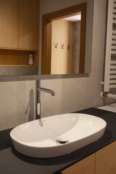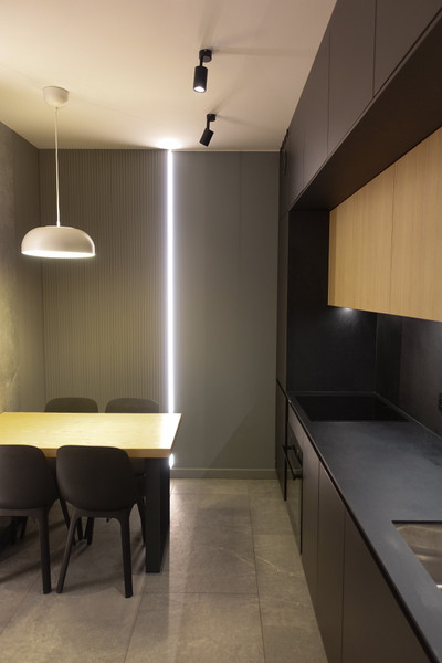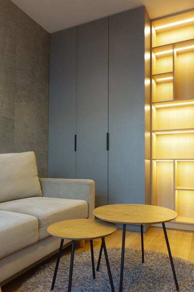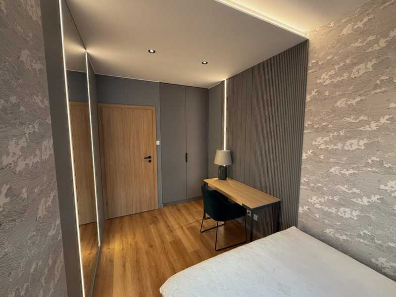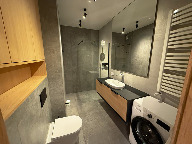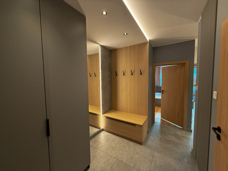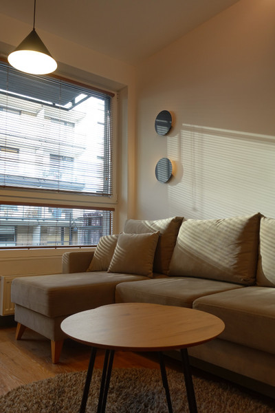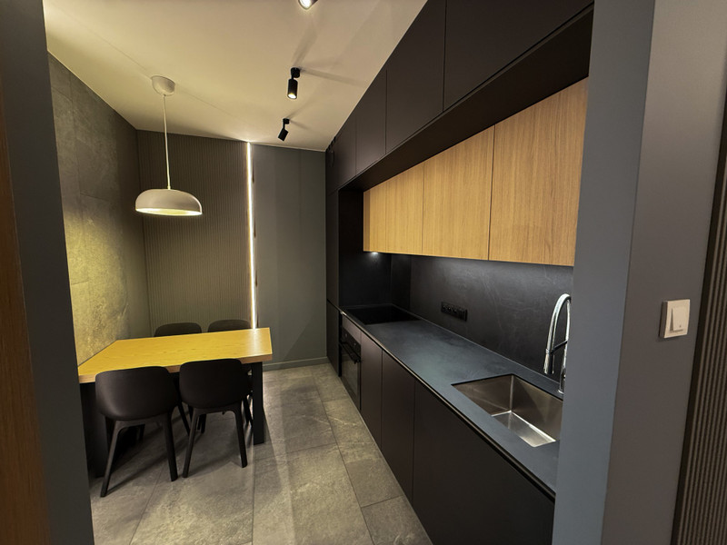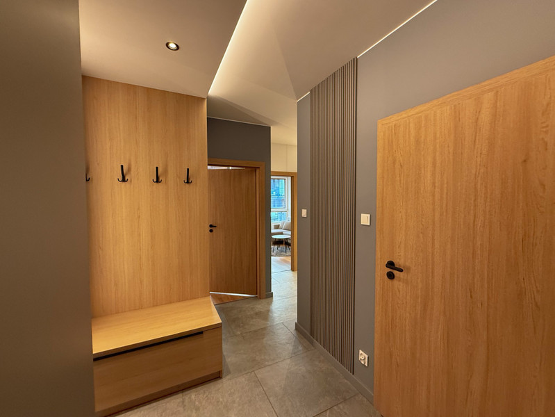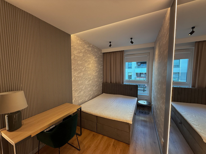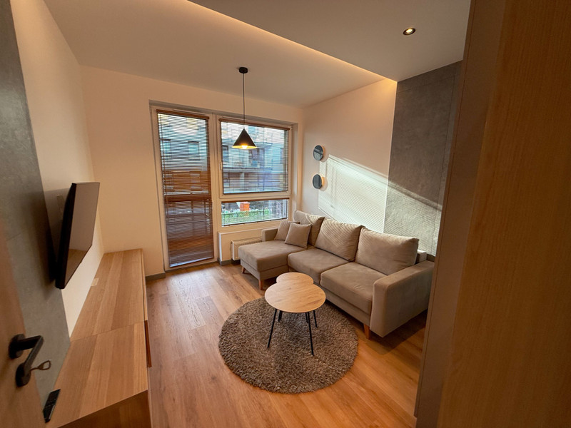 Mieszkanie składa się z salonu z częścią wypoczynkową, sypialni z dużym podwójnym łóżkiem, oddzielnej kuchni, łazienki z WC oraz przedpokoju. Całość została urządzona z dbałością o szczegóły i wyposażona w nowoczesny sprzęt AGD i RTV – lodówkę, zmywarkę, piekarnik, płytę indukcyjną, pralkę i telewizor. Zabudowa meblowa została wykonana na wymiar, a nowoczesne oświetlenie dodaje wnętrzu przytulności i stylu.