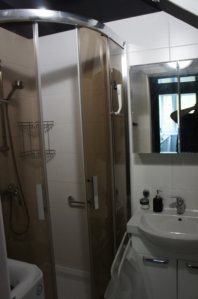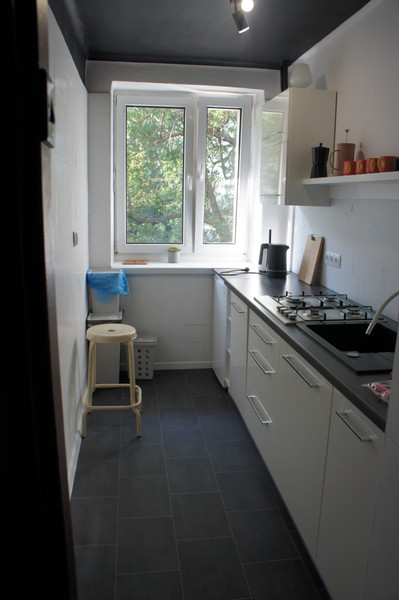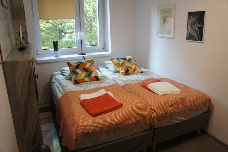 Dwu-pokojowe / ścisłe centrum Łodzi (46 mkw, wysokie 1-sze piętro, Wyposażenie: kuchnia z lodówką i zmywarką, łazienka z prysznicem i pralką, Wi-Fi, telewizor). Widok na korony starych drzew.