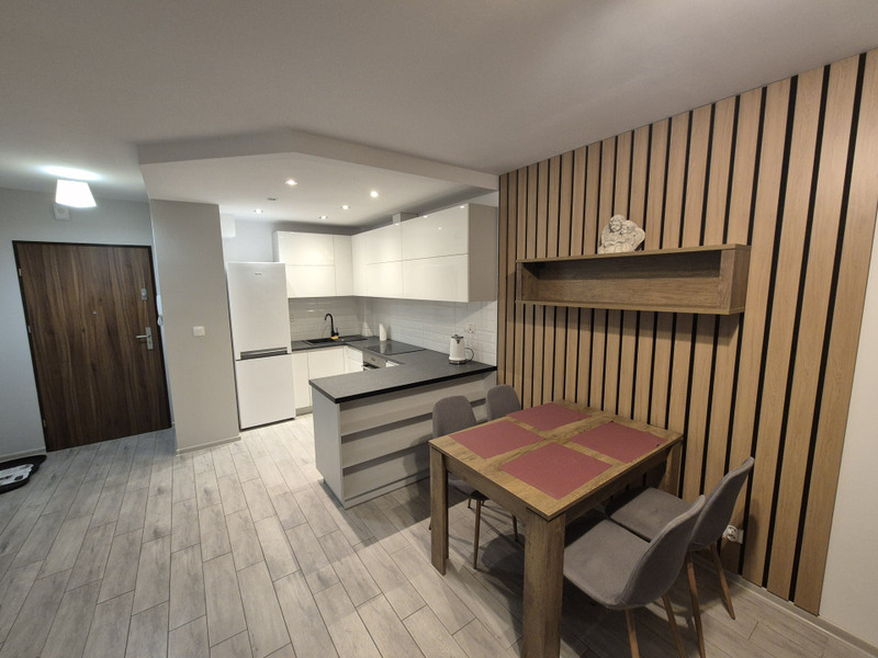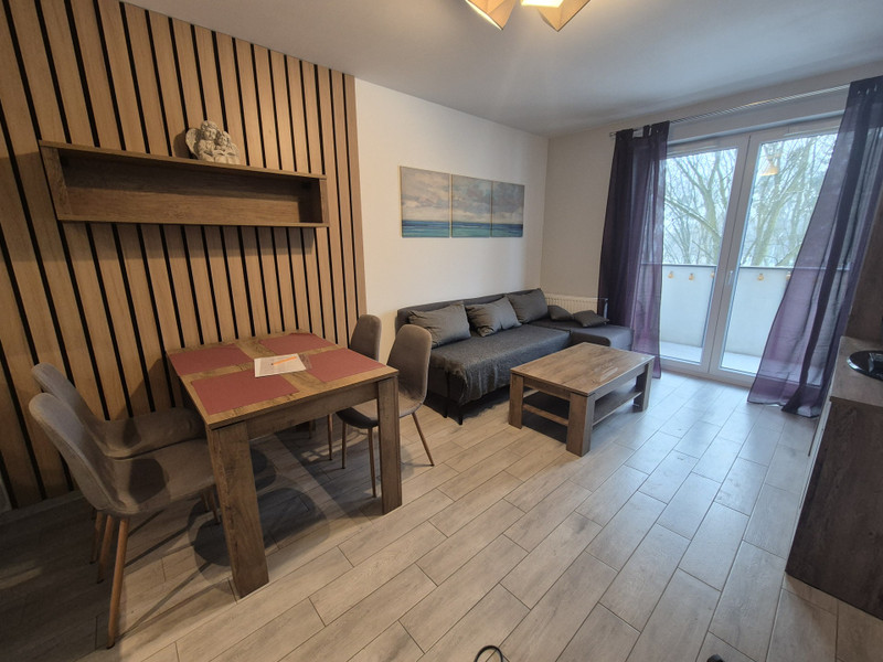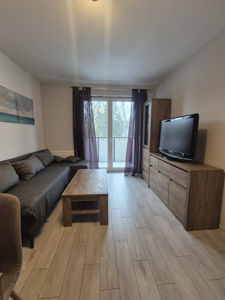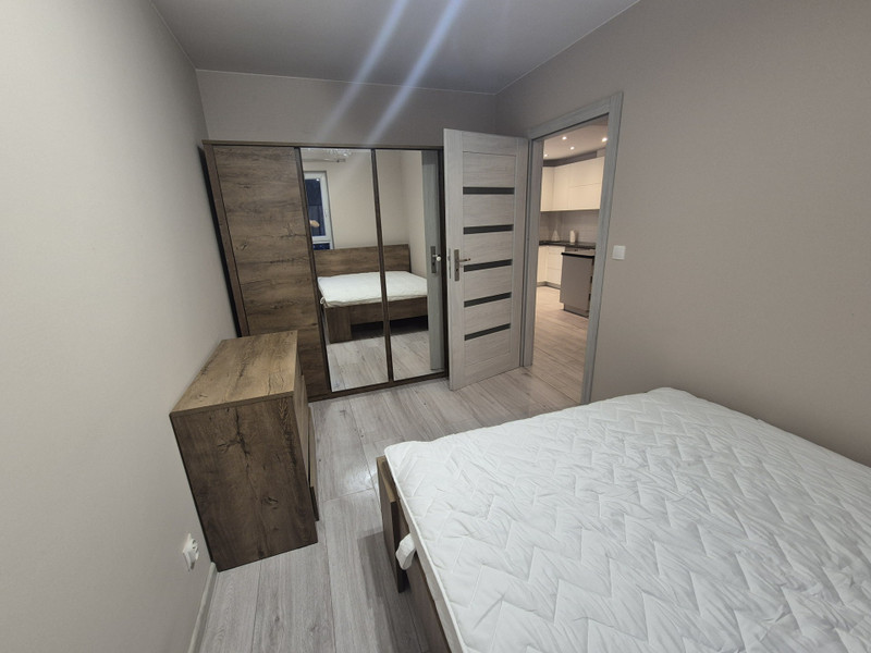 Mieszkanie znajduje się na drugim piętrze i składa się z dużego salonu z aneksem kuchennym, sypialni z bardzo pojemną szafą oraz łazienki (wanna z opcją natrysku). Aneks kuchenny jest w pełni wyposażony (lodówka, płyta indukcyjna, piekarnik, zmywarka, wyciąg).
