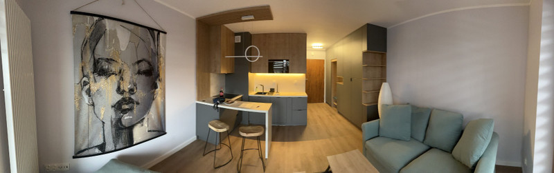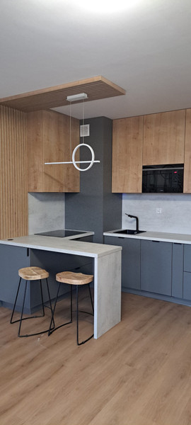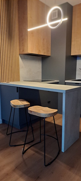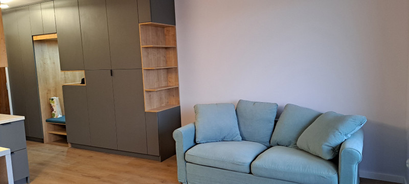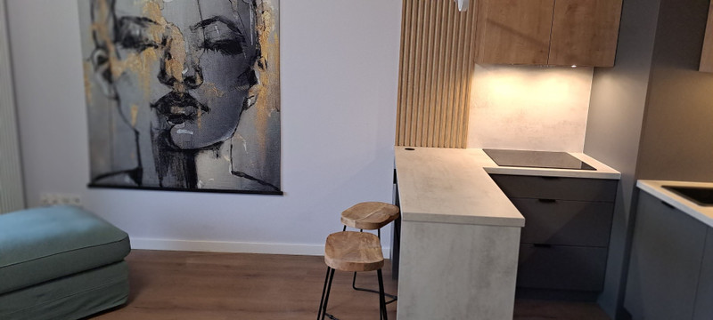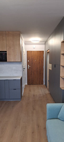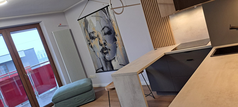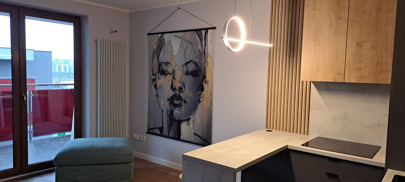 Kawalerka urządzona w stylu nowoczesnym. Salon połączony z kuchnią wyposażoną m.in. w zmywarkę i kuchenkę mikrofalową oraz płytę indukcyjną i lodówkę. Meble w salonie wykonane na wymiar przez stolarza. Istnieje możliwość podłączenia szybkiego internetu.