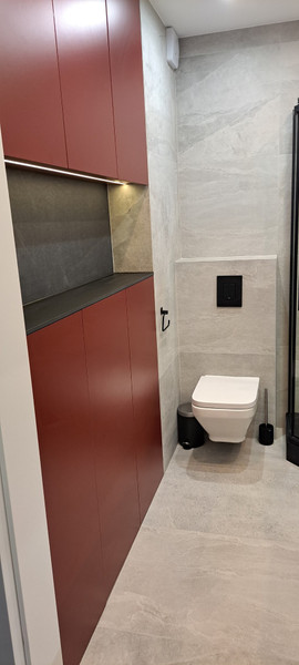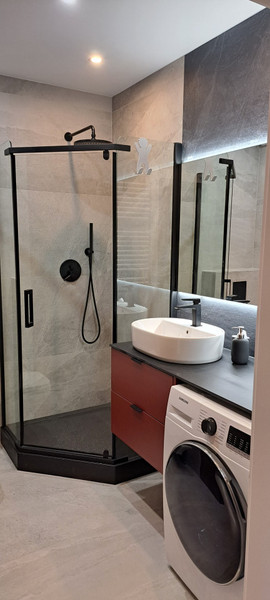 W łazience znajduje się prysznic oraz pralko-suszarka.