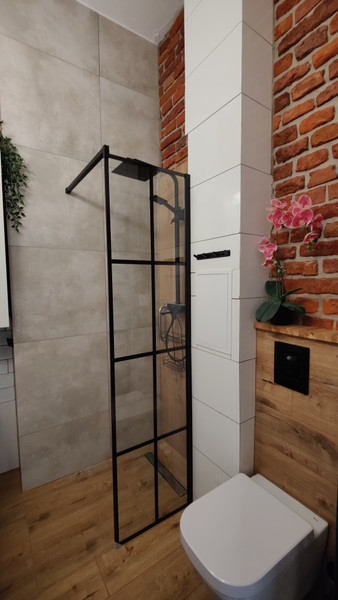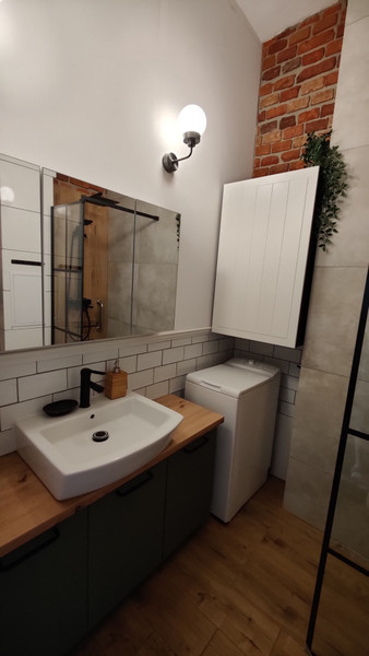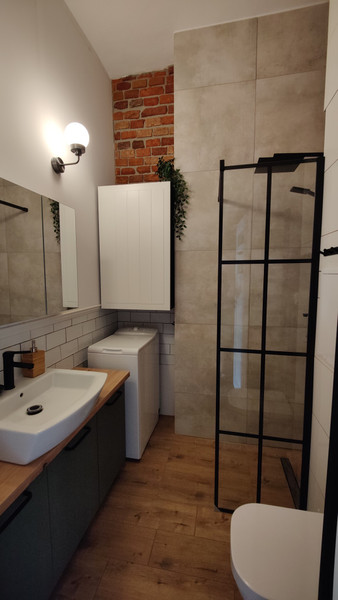 • wyremontowanej łazienki o powierzchni 4 m2 z prysznicem, toaletą, szafką z lustrem szafką pod umywalkową i pralką