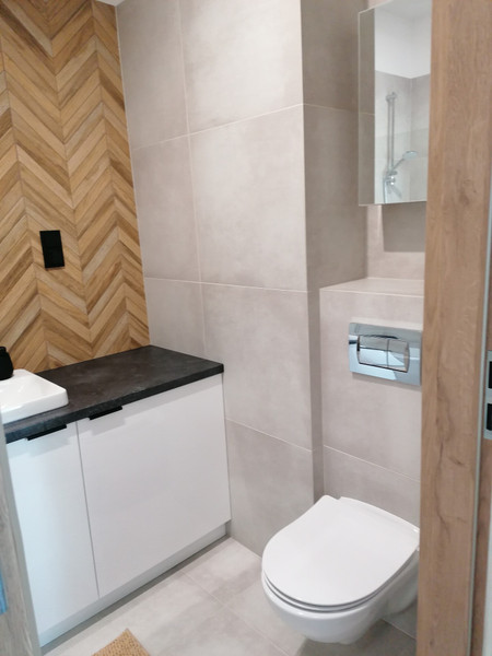 Mieszkanie nowe, w pełni wyposażone (pralka, zmywarka, lodówka, piekarnik) składa się z przedpokoju ,salonu z aneksem kuchennym oraz sypialni i łazienki.