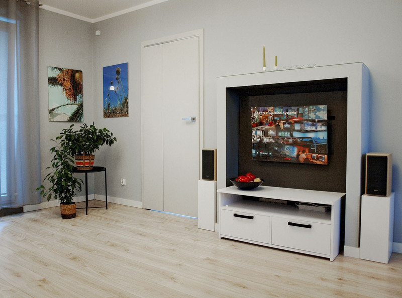 Salon: wygodne duże łóżko, stoliki kawowe, szafka dekoracyjna, kinkiety, szafa w zabudowie, stylowe miejsce na telewizor, szafka TV, kolumny oraz sprzęt grający.