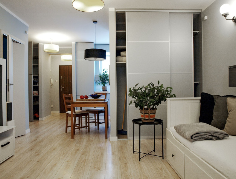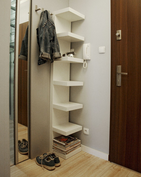 Garderoba i przedpokój: mobilny zestaw półek i drążków oraz wieszaków na torby, paski czy inne niezbędne akcesoria. To wszystko ukryte za lustrzanymi drzwiami. Przy wejściu regał i chowane wieszaki.