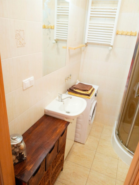 - łazienka: duży prysznic 90x90, regał, pralka