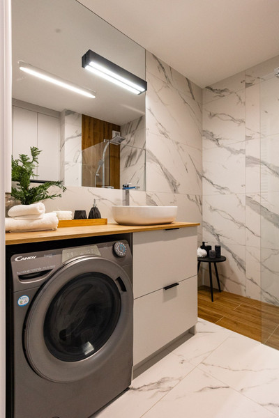 W łazience znajduje się prysznic, umywalka z szafką oraz geberit z zabudową i pralka.
