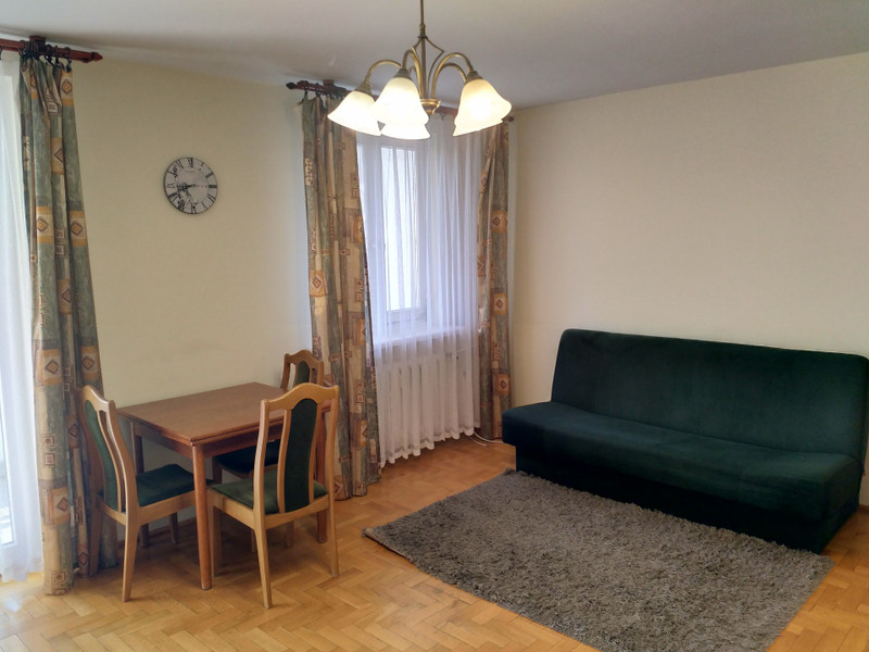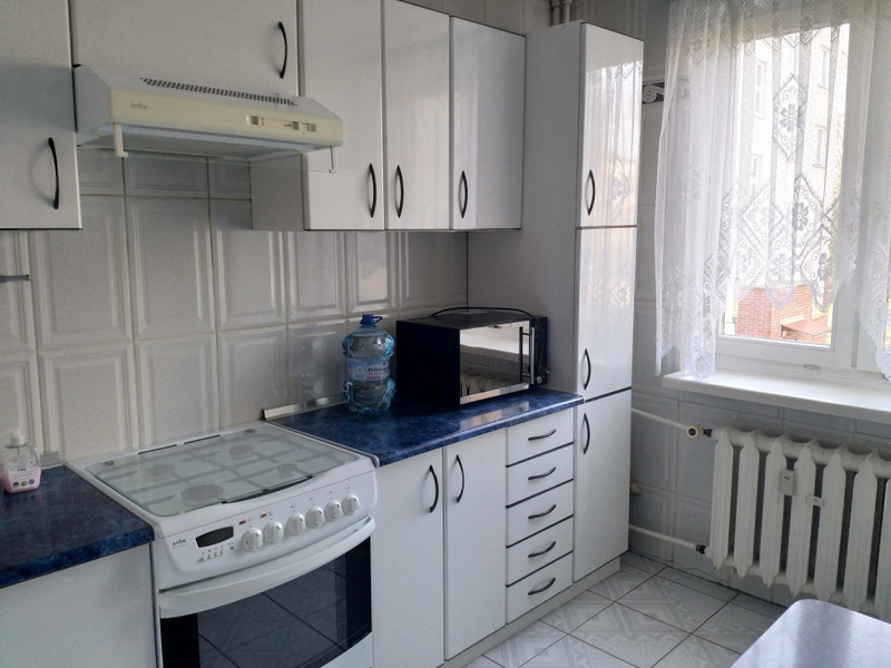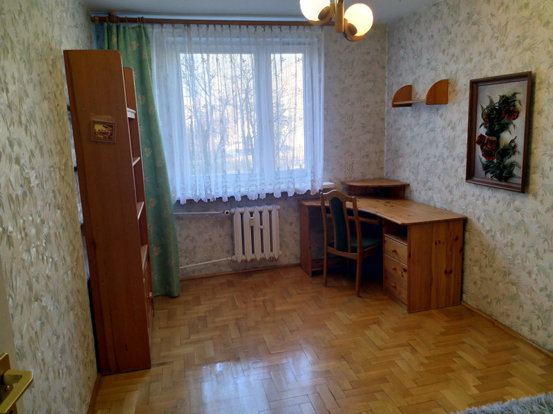 Większy pokój z oknami na południe i wyjściem na duży balkon. Oddzielna, wyposażona kuchnia i mniejszy pokój z oknami na północ. Łazienka z wanną, oddzielna toaleta, przedpokój z szafami wnękowymi. Wszystkie media z sieci miejskiej. Możliwość korzystania z komórki lokatorskiej.