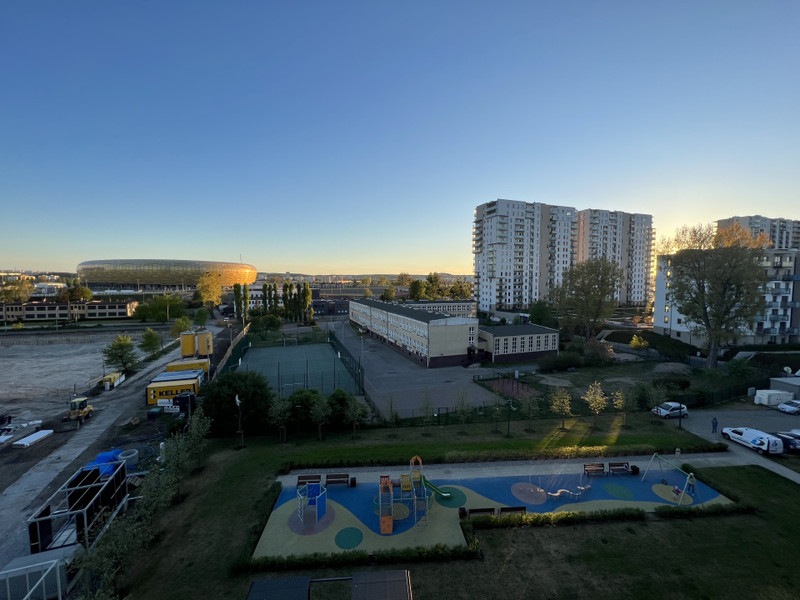 Z salonu rozciąga się niezabudowany widok na Stadion Polsat Plus Arena Gdańsk – bez sąsiednich bloków w tle. Duży dystans od innych budynków zapewnia pełen komfort i prywatność, rzadko spotykaną na nowych osiedlach.