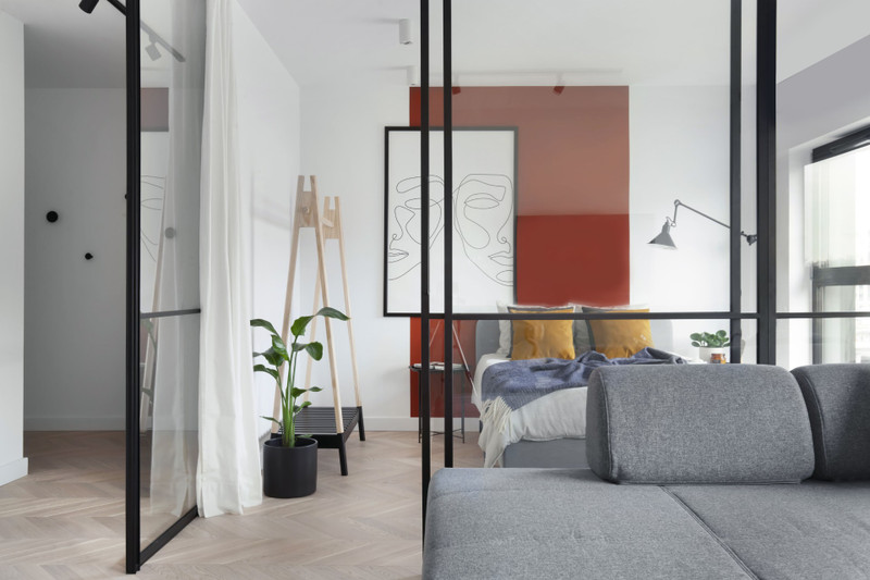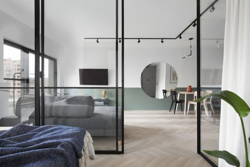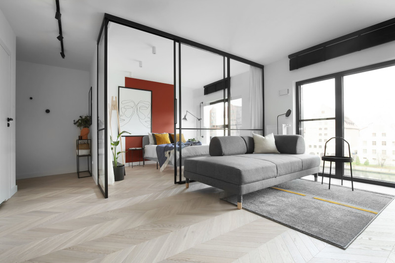 • jasny salon z dużymi oknami