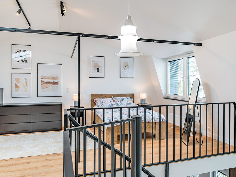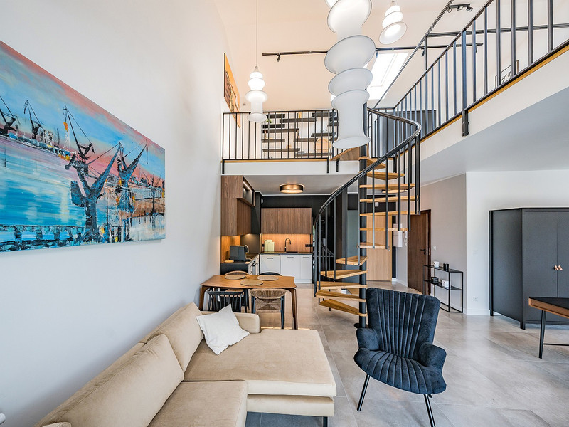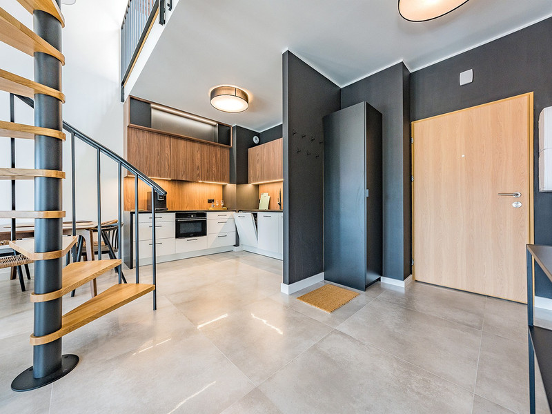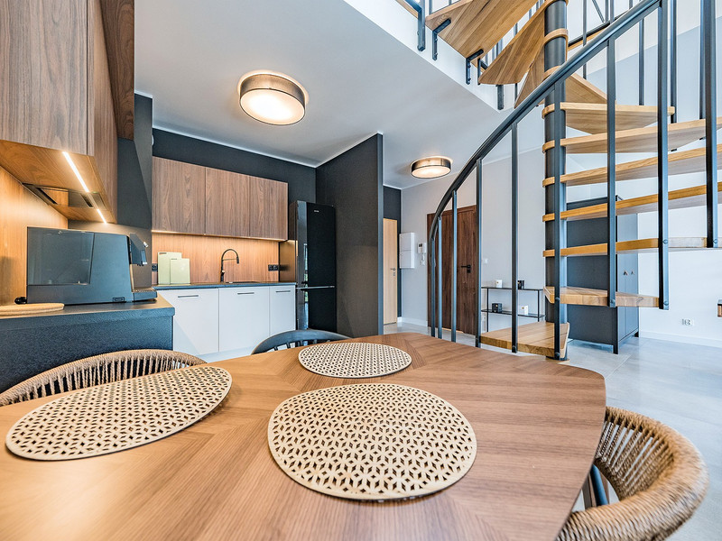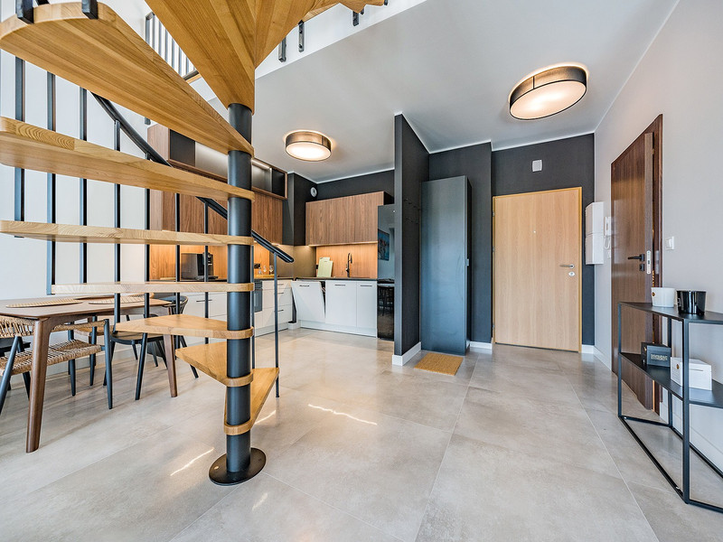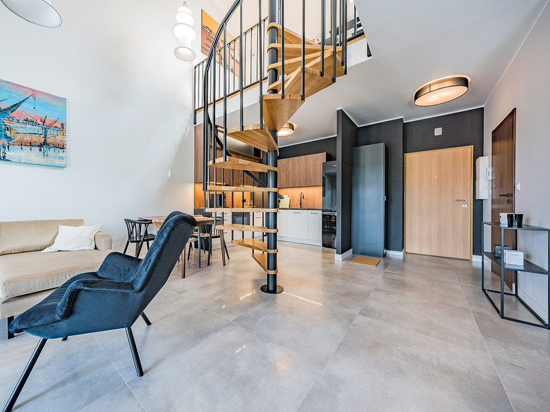 Wnętrze apartamentu doskonale uzupełnia drewniane schody prowadzące na antresolę. Kolejnym atutem jest duży balkon .