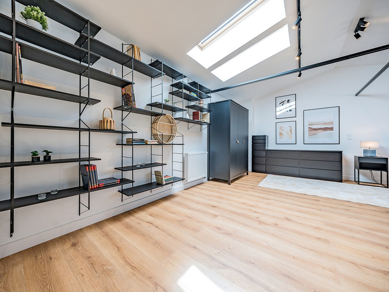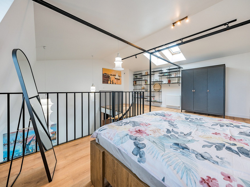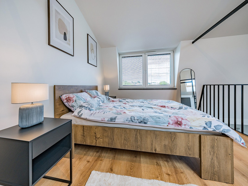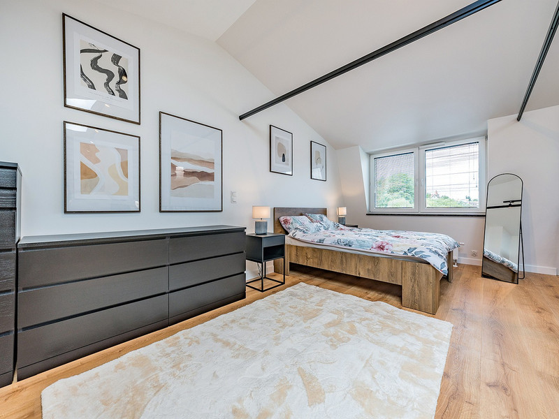 Przytulna sypialnia oferuje doskonałe warunki do odpoczynku. Duże okna oraz okna dachowe zapewniają dostęp do naturalnego światła i podkreślając przy tym przyjemną atmosferę w pomieszczeniu.
