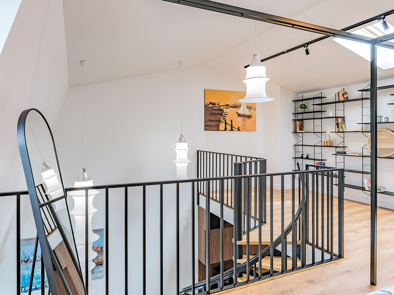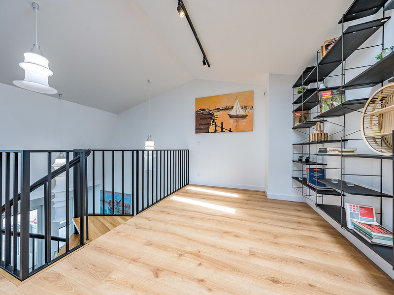 Poprzez schody można dostać się na antresolę, gdzie zlokalizowane są praktyczne szafy w zabudowie garderobianej z widokiem na salon.